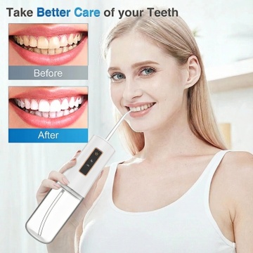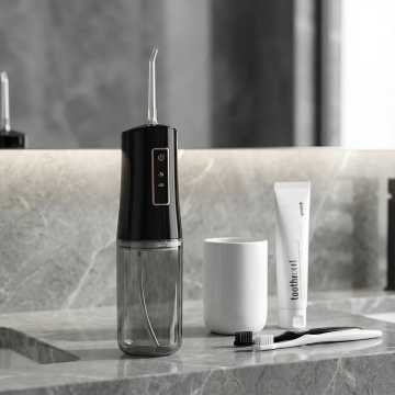 整体是简洁的 冲牙器 + 浅蓝色背景” 风格:浅调的背景营造出干净柔和的氛围,2款不同配色的冲牙器(黑、白)以错落的悬浮方式排列,既突出了产品的外观设计,也清晰展示了配色选项。