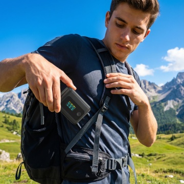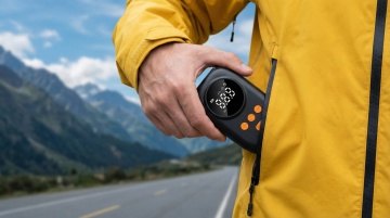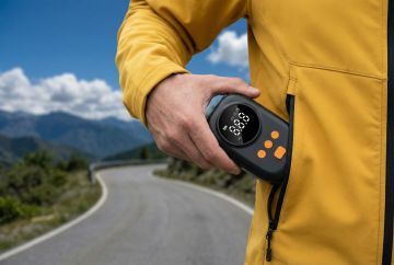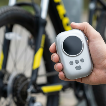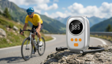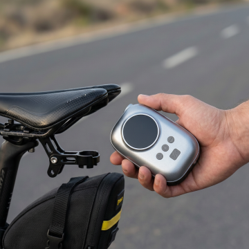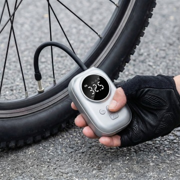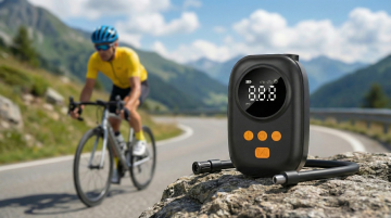 专业产品摄影风格,特写镜头,画面中央是一只戴着黑色骑行手套的手,正在操作图中的充气泵。手套材质为黑色合成皮革,表面有纹理设计,手指部分露出。黑色橡胶软管一头连着充气泵,软管末端连接到自行车轮胎的Presta气嘴上。背景是自行车轮胎的局部特写,轮胎为黑色橡胶材质,轮毂为银色金属,地面是灰色沥青路面。采用侧面角度拍摄,手部动作自然,正在给自行车轮胎充气。整体色调以黑色设备、黑色手套、银色轮毂、灰色路面为主,光线为自然光,营造出专业、实用、运动感的产品使用场景。摄影风格偏向商业产品摄影,细节丰富,质感真实,突出产品的功能性和专业性。