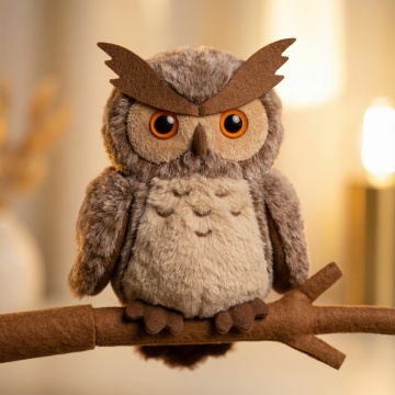 软3D风格的毛绒猫头鹰,融合面料质感与毛发生长细节,卡通造型萌趣可爱,暖光背景营造温馨氛围。