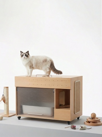 在一个温馨的下午,室内布局简单,在一个墙角处放着一个L型猫抓板,一只慵懒的小猫,正在L型猫抓板上磨爪子,伸懒腰。