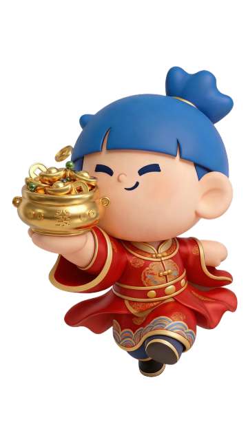 软3D风可爱卡通男孩,身着传统服饰,萌趣表情,节日氛围浓厚。