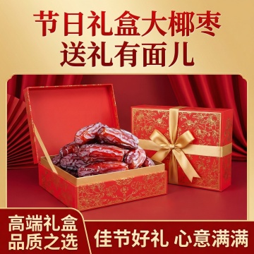 给图片的礼盒生成场景图,背景暖橙色调营造温馨氛围。画面右侧一只手正提着橙色的礼盒,礼盒前方摆放着一盘混合坚果(含红枣、荔枝干、核桃等),旁边散落着果整体构图突出产品新鲜质感与节日送礼场景。