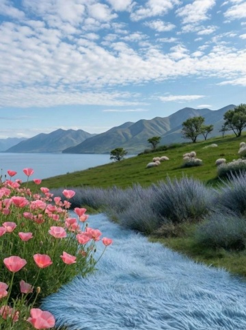 清新水彩插画风,湖光山色映蓝天,自然宁静。