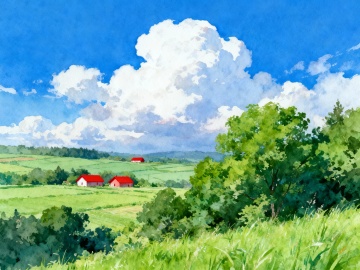 广阔的蓝天占据画面大部分区域,下方是连绵的青草地,几朵白云点缀在蓝天上,整体画面简洁清爽,水彩画风格,色彩明快柔和,可作为背景使用。