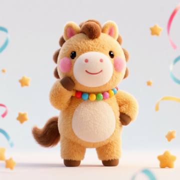 软3D毛毡风小马跃动于花丛,毛发生长质感细腻,卡通梦幻场景洋溢春日清新与可爱治愈感。