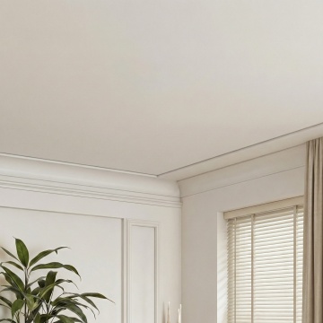 极简主义风格浴室设计,柔和的米白色墙面,温暖的自然光透过白色窗帘洒入,形成柔和的光影效果,地面铺设浅色大理石瓷砖,中央放置一个造型简约的独立式白色浴缸,黄铜色金属水龙头,浴缸旁地面随意摆放一条浅灰色柔软毛巾,右侧角落有一盆绿色植物置于编织篮中,整体氛围宁静、优雅、舒适,布局简洁开阔,空间感强,材质质感细腻,色彩和谐统一,营造出高级而温馨的沐浴环境。
