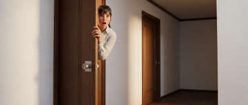 环境为室内。门的颜色为棕色,女人只露出上半身,没有露出腿部,女人的表情有点着急和不高兴,以3d动画渲染方式重绘
