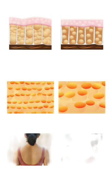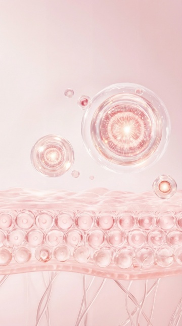 高度写实的3D医学解剖插画,皮肤多层结构的立体剖面展示,顶层有三根粗壮、乌黑、表面光滑的毛发从毛囊中长出,毛囊根部附着红色颗粒状物质,中层可见排列整齐的粉色圆形细胞结构,底层是黄色蜂窝状组织,其间分布着红色管状结构并向外渗透粉色微粒,整体色调以肉粉色、淡黄色、红色为主,光影柔和,立体感强,细节清晰,具有科学严谨的医学可视化风格,突出皮肤各层组织的微观结构和相互关系。