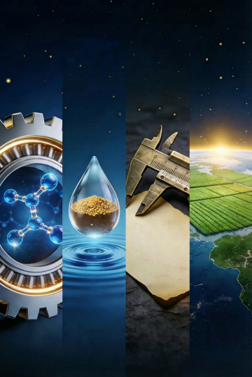深蓝色渐变背景,顶部由六边形粒子构成的抽象世界地图轮廓,中间分布着六边形发光粒子与几何线条构成的科技感图案,底部为蓝色发光同心圆光环,整体呈现神秘深邃的科技氛围,光影效果柔和,粒子边缘锐利清晰,具有强烈的未来感和数字科技感。