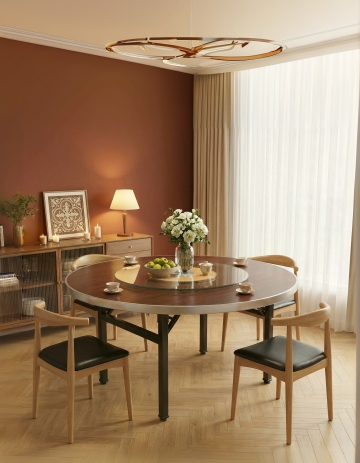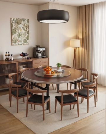 构图:平视角度(突出 “餐桌 + 圆凳的实际使用比例”),景深适中,主体木纹清晰、背景餐边柜轻微虚化。””