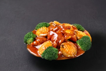高质感美食摄影,暖色调灯光营造温馨氛围,深色木质餐桌上铺着绿色芭蕉叶,中央摆放黑色陶锅盛装的红烧大块肉,表面点缀白色菊花与绿色香菜,周围环绕多道菜肴:左侧两碗白米饭撒有葱花,前方白色瓷盘盛有菠萝虾仁沙拉,右侧银色金属碗装彩色蔬菜丁,背景有棕色陶罐与插着橙色花朵的白色瓷瓶,整体构图饱满,食物细节清晰,光影层次丰富,营造出丰盛诱人的餐饮场景。