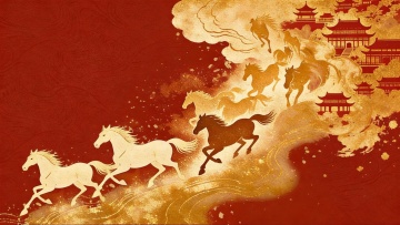 国潮风插画,以几何与粒子技法呈现骏马,融合水墨晕染与古典云纹,红金配色彰显喜庆中式感,尽显传统美学与现代设计的碰撞。