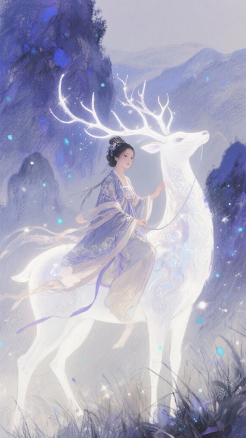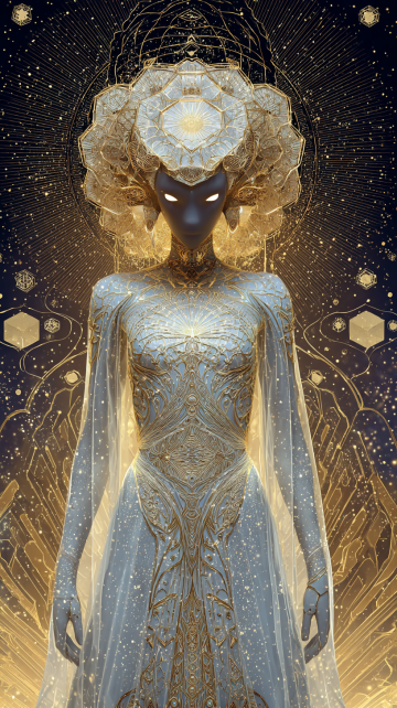 Celestial light entity with opalescent pearl-like skin (faint rainbow iridescence), intricate glowing bronze geometric patterns (hexagons, spirals) wrapping the torso; luminous eyes like glowing moonstones, form partially obscured by swirling cosmic fog; flowing gown of sheer gold and pale blue (translucent, with subtle star embroidery), trailing stardust particles; background of deep space with a swirling spiral nebula, radiating golden halos of light, faint crystal clusters glowing softly; symbolist digital painting, ethereal sacred energy, high contrast between light and dark, hyper-detailed iridescence and fog textures, 4K wallpaper, grand and serene