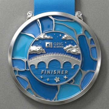 一枚高写实风格的银色奖牌,表面呈现细腻的磨砂质感与柔和的金属光泽,边缘装饰有精致的绳结纹与圆珠纹双层边框,中央为光滑的圆形区域,通过金属拉丝工艺形成细微的平行纹理,顶部连接着一条深红色的丝绒绶带,绶带边缘有自然的褶皱,整体悬挂于纯白色纯色背景上,光线从斜上方照射,在奖牌表面形成清晰的明暗交界线与柔和的阴影,突出金属的冷峻质感与立体层次。