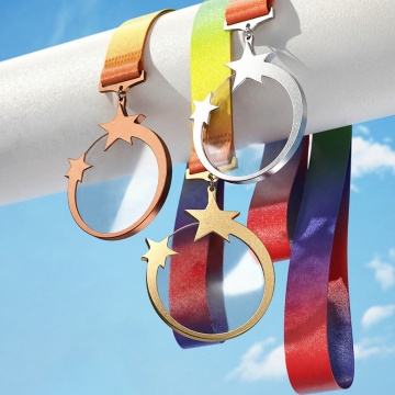 六个不同样式、不同材质的勋章,白色背景,排列整齐,3D渲染,超写实质感,金属光泽,高光与阴影对比强烈,细节精致,立体感强,奖章边缘锐利,中心图案清晰,绶带垂坠自然,整体视觉层次分明,专业设计感,高品质CG渲染效果
