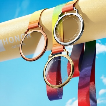 六个不同样式和材质的勋章,保持3D立体风格,表面有明亮的高光和柔和的阴影,采用金色、银色、铜色等金属质感,部分勋章带有宝石镶嵌或雕刻花纹,每个勋章底部配有不同颜色的缎带,整体排列整齐,背景为纯白色,光线从左上方照射,营造出精致、正式且具有荣誉感的氛围