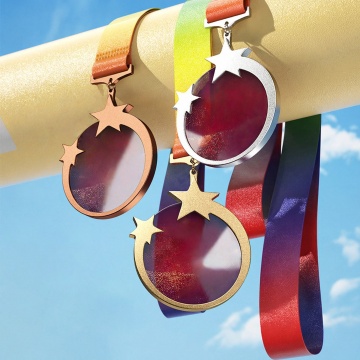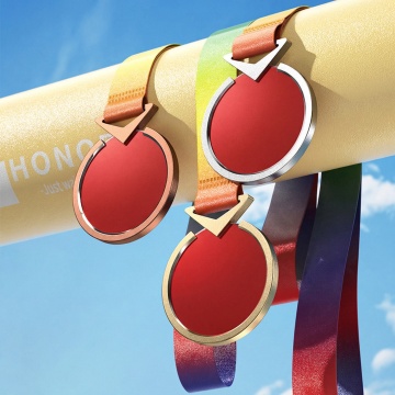超写实主义风格,三枚奖牌从左至右水平排列,左侧为金黄色金牌,中央嵌有立体数字“1”,边缘呈放射状锯齿形,顶部有高光白点;中间是银白色银牌,中央为立体数字“2”,边缘同样为放射状锯齿形,顶部有高光白点;右侧为铜色铜牌,中央是立体数字“3”,边缘放射状锯齿形,顶部有高光白点。每枚奖牌下方悬挂着红色丝带,丝带呈对称的倒V字形垂落,整体画面背景为纯白色,色彩鲜明,金属质感强烈,光影过渡自然,细节精致,立体感十足。