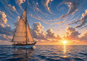一幅展现帆船在广阔海面上航行的摄影作品,整体呈现温暖的日落色调,天空从顶部的明亮橙黄色逐渐过渡到底部的柔和橘红色,巨大的金色太阳位于画面上方中央,光芒万丈,在平静如镜的海面上投射出一条长长的、闪烁着金色光芒的倒影,延伸至画面下方中央。一艘白色的单桅帆船正航行在这片金色的海面上,帆船体积较小,位于画面中下部,船帆饱满,清晰可见,船身及船帆在水面上形成清晰的倒影。海面呈现出从近景的深蓝色向中远景的金黄色渐变的色彩层次,水面波光粼粼,细节丰富,展现出写实的海水质感和光影效果。画面采用极简的构图,大面积的天空和海面形成开阔的留白,营造出宁静、悠远、壮丽而又充满希望的氛围,没有任何文字、LOGO、二维码或多余元素干扰主体视觉。