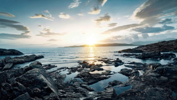 胶片风实景海景,日落余晖洒于岩滩,光影交织,静谧宽阔,水纹清透,质朴自然,柔光映照,舒适悠然。
