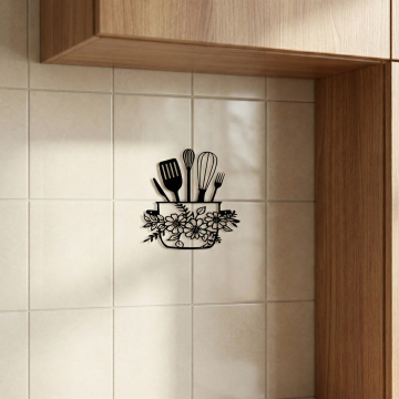 极简主义风格的餐桌背景,柔和的浅色调墙面,温暖的自然光透过窗户形成清晰的几何阴影投射在桌面上,木质餐桌表面带有细腻的木纹和自然的光影变化,左侧摆放着两个木质容器,里面整齐插着不同尺寸的木勺和金属餐具,右侧是一叠浅绿色的陶瓷盘子和一小盆新鲜的绿色植物,整体氛围宁静、温馨、充满生活气息,具有高度的3D质感和真实的材质表现,构图简洁平衡,视觉焦点明确。