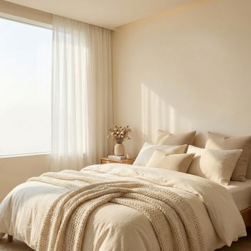 一张温馨风格的卧室床铺三维渲染图,浅米色软包床头板搭配同色系床架,床上铺着浅棕色与白色交织的格纹被子,被子自然蓬松有褶皱,上方摆放两个白色长方形枕头和一个同色系格纹小抱枕,整体色调温暖柔和,光线明亮柔和从侧面照射形成轻微阴影,展现出舒适柔软的织物质感,营造出宁静舒适的居家氛围。