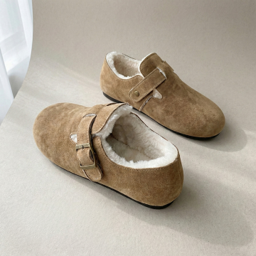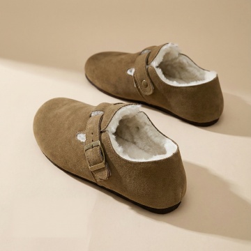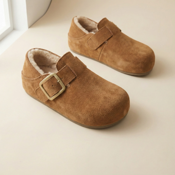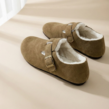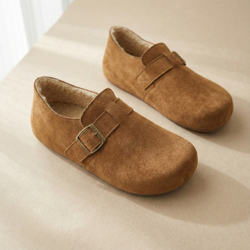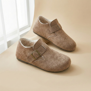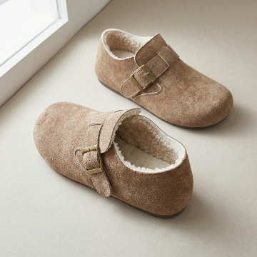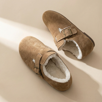构图: 正方形画布,产品采用对角线构图,一只鞋在前(左下区域),一只鞋略靠后在上方,形成前后错落感。产品整体占据画面约60%。 视觉焦点: 左下角的前鞋为主视觉点,鞋口朝向画面中心,确保能清晰看到鞋款完整外观与内部的毛绒内里细节。 背景与光线: 浅米色或浅灰色哑光背景纸,左侧窗边自然光模拟,光线柔和,在鞋面产生细腻的明暗过渡,突出皮革质感与毛绒的柔软。 元素与留白: 画面极其干净,无任何多余装饰。在左下角主鞋下方预留明显空白区域,用于您添加“送赠品”文字和小图标。 画面感觉: 安静、聚焦、充满细节质感,让人第一眼就能感受到产品的材质与工艺。
