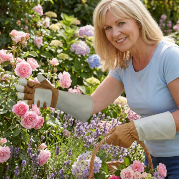 保持手套细节不变,分清正反面,一个外国美女穿着这双手套在花园采花、