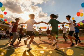 广角俯拍视角,现代化中学体育场的黄昏全景,深红色塑胶跑道在夕阳下泛着温暖光泽,六道白色分道线如钢琴键般延伸至画面深处,弯道处有几个穿着蓝白校服的学生正在进行变速跑训练,他们的影子被拉得很长。跑道内侧是修剪整齐的深绿色人工草坪,几名女生正围坐成圈进行拉伸运动。左侧的灰色看台坐满了观看校际足球赛的学生,他们挥动着蓝白相间的校旗,遮阳棚的金属结构在暮色中投下几何形状的阴影。背景中五层米色教学楼的窗户透出温暖的灯光,与远处渐变成粉紫色的天空形成柔美过渡,几棵高大的梧桐树在微风中摇曳,将斑驳的影子投射在跑道上。空气中弥漫着青草和塑胶的混合气味,远处传来操场广播里播放的轻音乐和学生们的欢呼声,整体色调从橙红向靛蓝渐变,营造出既充满运动活力又带着青春黄昏特有的温馨氛围。