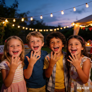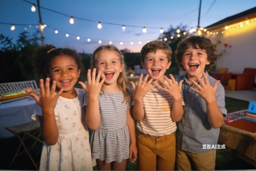 喜庆感十足的儿童生日派对,卡通风格与实景结合,轻拟物风装饰搭配拼贴元素,梦幻清新,充满欢乐氛围。