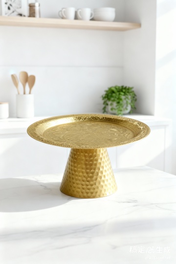 一个明亮整洁的现代厨房,采用简约优雅的设计风格,以白色为主色调,搭配黄铜色金属装饰细节。厨房整体呈现出温馨舒适的氛围,阳光透过百叶窗洒入,在白色橱柜和大理石台面上形成柔和的光影效果。白色的橱柜带有黄铜色的圆形拉手,上方的吊柜和下方的地柜组合提供了充足的储物空间。大理石台面光滑洁净,带有自然的灰色纹理。台面上有一个双槽不锈钢水槽,搭配黄铜色的水龙头。水槽旁边的金属桶里插着木质的锅铲和汤勺。墙面安装着黄铜色的挂杆,上面挂着各种木质和金属材质的厨房用具,包括勺子、铲子等。挂杆上方的白色搁板上摆放着不锈钢和玻璃材质的储物罐,里面装着各种香料和食材。台面上还摆放着一个白色的盘子,里面放着几块叠在一起的三明治,旁边还有一盘色彩鲜艳的沙拉。整体构图采用了三分法,光线从左侧窗户进入,营造出明亮通透的感觉,细节丰富,质感细腻,展现出干净利落的现代厨房设计感。