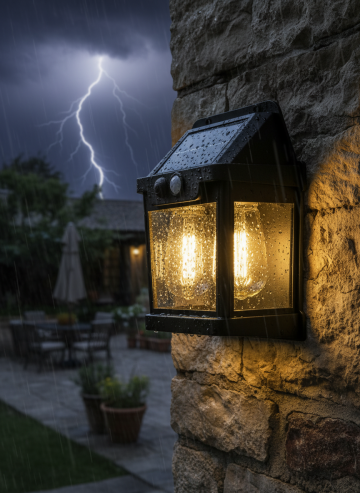 把产品安装在白色水泥墙上,后面是模糊庭院,晚上亮白光,下着大雨闪电,产品也有雨水 “焦点在壁灯上” 产品需要很清晰