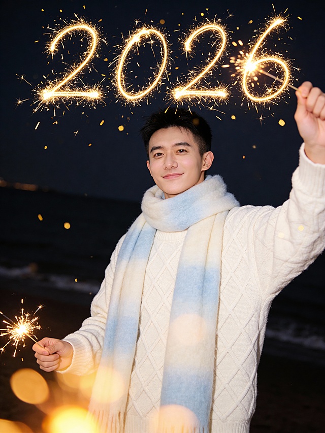 梦幻光影交织,少女手持烟花勾勒“2026”,插画风与粒子光效融合,双重曝光营造超现实浪漫氛围,温馨喜庆中透出唯美年味。详情