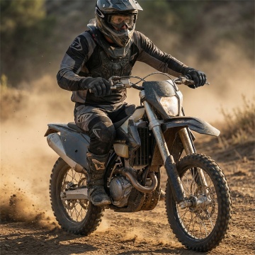 赛博朋克风夜景中,骑手疾驰于未来都市,金属质感机车与霓虹光影交织,头盔静置路面,虚实交错,科技感与酷炫感并存。