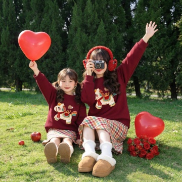 国潮风新年写真,红毛衣搭配传统春联,温暖实景中传递喜庆与温馨,面料质感细腻,中式年味十足。