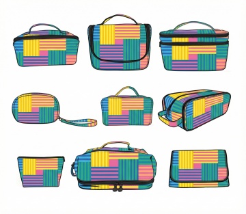 一套色彩丰富多样的行李箱系列插画,保持原有的简约扁平风格,每个行李箱拥有完全不同的配色方案,箱身表面装饰有丰富多样的几何图案、波点、条纹、花卉等元素,行李箱的基本结构(带竖条纹的箱体、黑色拉杆、黑色滚轮、侧提手)保持不变,所有行李箱整齐规整地排布在纯色背景上,整体构图平衡有序,视觉元素丰富多变,色彩明快鲜艳,具有强烈的装饰性和设计感。