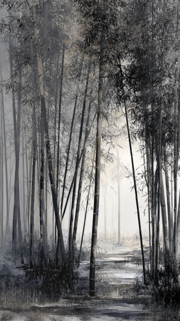 竖版构图,水墨晕染的青灰色迷雾竹林,晨雾如轻纱般缠绕着挺拔的翠竹,月光从竹叶缝隙中渗出清冷的银蓝色光束。前景是湿润的青石板路,苔藓点缀的石板上有半月形水洼,倒映着上方摇曳的竹影与破碎的月光。中景几棵老竹苍劲挺拔,竹节处墨色浓淡变化自然,右侧丛生的蕨类植物以淡绿渲染,远处竹林在雾气中渐变为朦胧的灰紫色轮廓。整体氛围空灵幽静,笔触保留水墨特有的飞白与渗透质感,色调以靛青、石绿与墨黑为主,月光区域泛着冷银色微光,营造出"空山新雨后"的东方禅意空间。