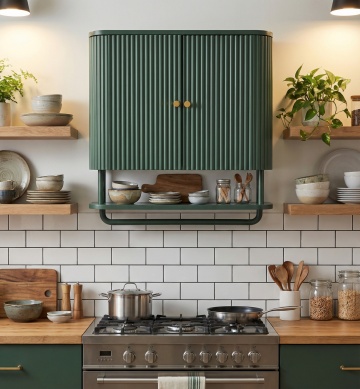 现代感与质朴感交融的厨房设计,3D风呈现金属与木雕元素,简约主义布局搭配清新绿植,营造舒适自然的烹饪空间。