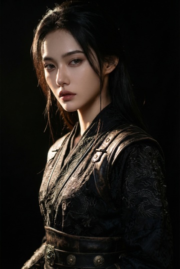 真人写实摄影,少女,妖治 达尔丁效应 瓜子脸 冷白皮 战国袍,华丽,多装饰,长头黑发。