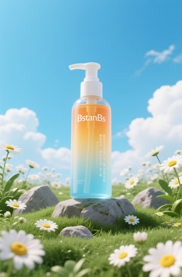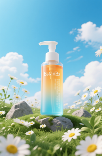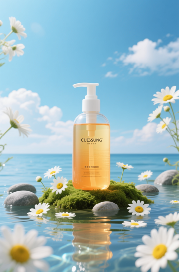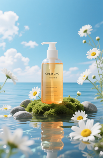 洗发水海报设计,两瓶深绿色透明液体洗发水瓶,搭配黑色按压泵头和白色标签,标签上有黑色文字与金色装饰细节,瓶身优雅放置于浅棕色木质树枝上。树枝下方是清澈湿润的水面,点缀着光滑石头,周围环绕着鲜活的绿色植物枝叶与根茎。整体采用清新自然的绿色调,柔和的侧光照明营造出宁静、有机、纯净的氛围,背景为渐变浅绿色。画面视觉层次清晰,以产品为绝对主体,光影效果细腻,水面呈现清晰的瓶身倒影,整体质感写实,设计简约自然,传达出天然植物萃取的产品特性。