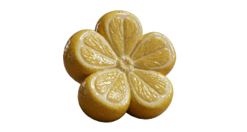 极简主义构图,白色背景上悬浮着四个几何化柠檬元素的精密编排,左上角是带三片锐角绿色叶子的正圆形完整柠檬,右上角为120度扇形的柠檬切片露出7颗完美排列的籽点,底部左侧是16道放射状纹理的柠檬横切面(中心有星形果核),底部右侧为带1/4圆弧果皮的半月形柠檬切面,所有元素采用2px白色描边勾勒的平滑矢量轮廓,填充色为从#FFD700到#FFA500的渐变黄色,元素间距遵循斐波那契数列比例,整体形成隐形的菱形视觉平衡,无任何文字和装饰元素。