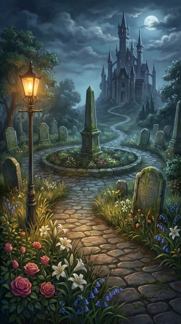 帮我生成图片:比例 「9:16」生成花园场景,一条路伸向远方,场景细节复杂,有花,草,路灯,花坛,板凳,由近到远的构图,游戏平面宣传画的风格,