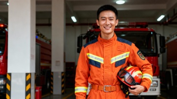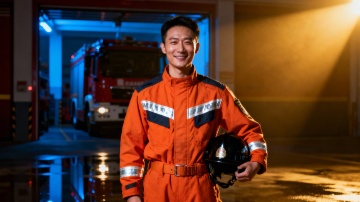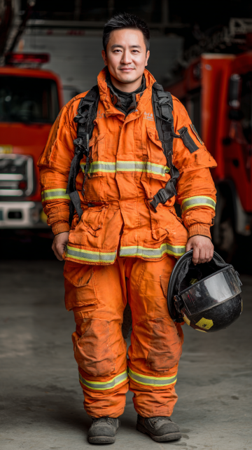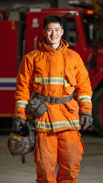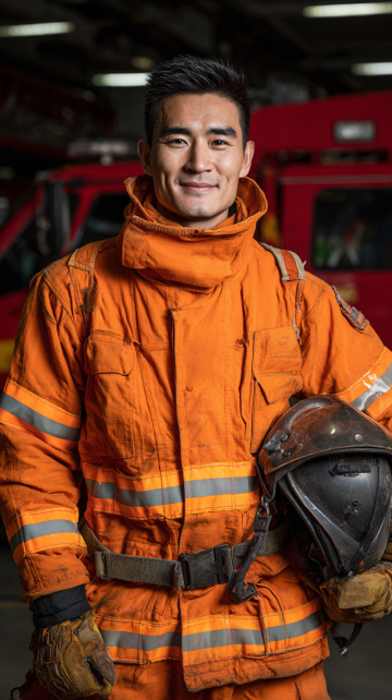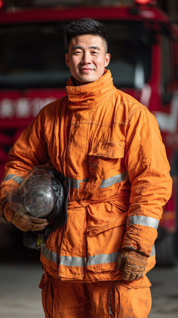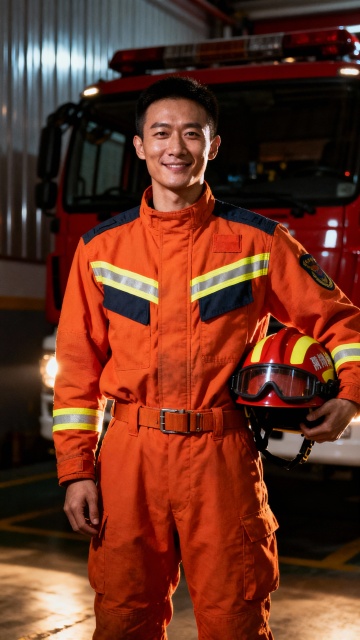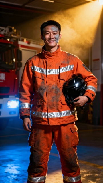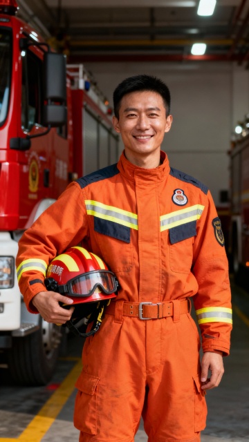 生成了一张30多岁中国男性消防员的正面肖像,他身穿带有反光条的崭新橙色全套消防防护服,左手腋下夹着头盔,表情坚定且面带微笑,面部和衣服干净,站在消防站车库内,身后隐约可见红色消防车,采用戏剧性灯光效果,比例为16:9。高清画质16K。