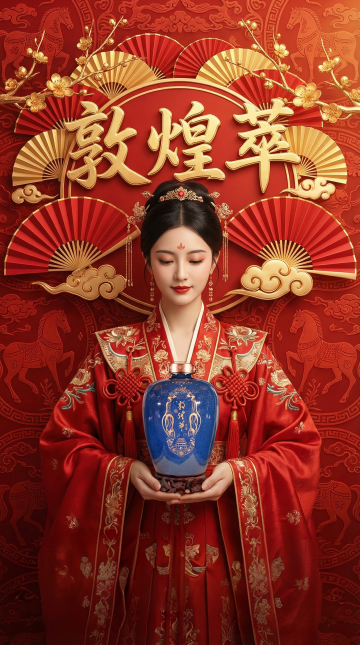 9:16的长图海报,写实风格,一位年轻漂亮的美女,穿着明红色新中式汉服,服饰搭配刺绣,服饰搭配中国结,头饰优雅漂亮中国风,双手捧着这坛酒(要求酒坛内容及形状严格不变)。马年元旦海报,以红色为主体色调,背景为带有精致马纹的传统纹样。画面中心是烫金浮雕 “敦煌萃” 书法大字,周围环绕红色与烫金相间的折扇、金色梅花等传统元素,层次感,形成圆形5D立体视觉框架效果。文字包含 “马年大吉 万事如意”“辞旧纳千祥 迎新增百福”等祝福语,字体风格大气且富有传统韵味。整体呈现出浓厚的中国传统节庆风格,运用烫金、浮雕质感的设计手法,细节精致华丽,充满元旦与马年的双重喜庆氛围,文化韵味十足。
