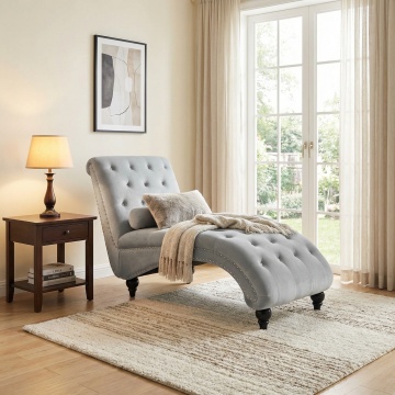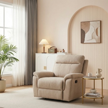 - **浅米色功能休闲椅**:布艺材质,靠背/扶手饱满柔软,侧边带收纳袋,兼具舒适感与实用性;