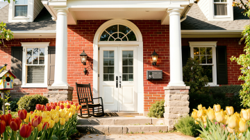 3D渲染风格的玄关场景,柔和自然光从右侧窗户洒落,形成温暖的光影效果,浅色木地板带有自然纹理和柔和反光,中央位置是一扇浅木色的简约平板门,门把为黑色金属材质,门的左侧是一个浅木色矮柜,上面摆放着两个白色陶瓷花瓶和一个金属装饰品,右侧是一个同色系的多层储物柜,顶部放置着插有干花的透明花瓶,墙面为纯白色,挂有三幅简约线条装饰画,地面铺有几何图案的深色地毯,整体色调以原木色、白色和浅灰色为主,营造出宁静、简约、自然的北欧家居氛围。