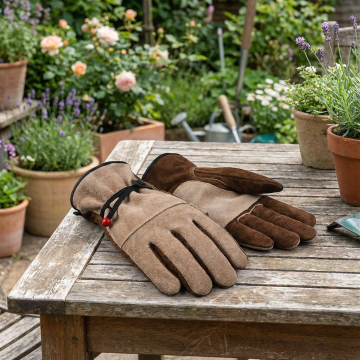 换个背景,这双手套放在花园桌上