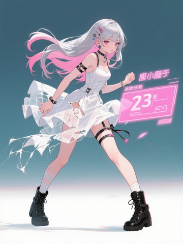 唐小糖,23岁叛逆千金,撕裂的婚纱裙摆,染着粉银挑染,多耳钉,脚踩马丁靴。赛博朋克混搭潮流风,高能量感 风格:都市动作感,叛逆青春