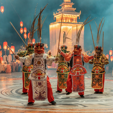 暗夜中的中式鬼魅,刺绣华服与浮雕头饰交织神秘,双重曝光的幽瞳环绕,3D质感强化哥特惊悚,光影沉郁,古典民族风中透出灵魂的低语。
