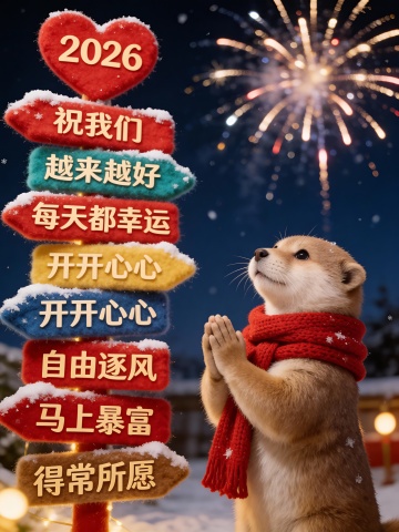 有一面墙占满整个画面,墙的颜色是乳白色。墙中间有一个方块,方块上有字:下一站,2026。方块的周围是其它方块(有长方形、正方形、圆形等形状),方块之间可以挨得紧一些,方块的风格参考参考图中的风格,考虑到冬天,加入一些积雪。每个方块上都有一个成语,成语只能从指定的这些成语中选择:日进斗金、好事成双、平安喜乐、上上签、开开心心、身体健康、万事如意、学有所成、工作顺利、所求皆所愿、旺财、幸运、大吉大利、