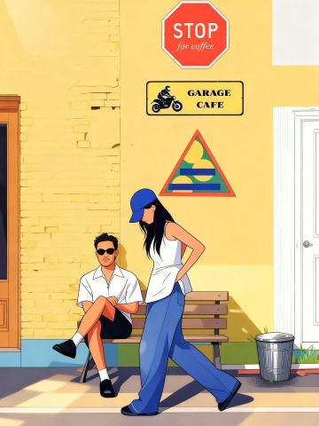 清新水彩风插画,描绘夏日街头的青春活力,色彩斑斓,充满生活气息。